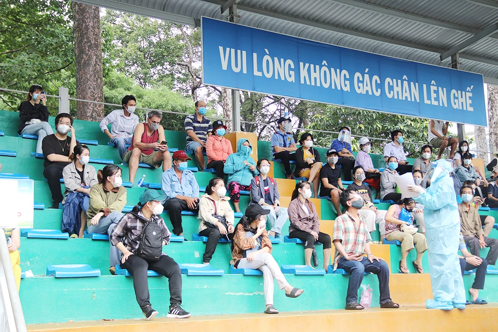 Người dân ngồi chờ đến lượt tiêm ở sân vận động Tao Đàn, quận 1.