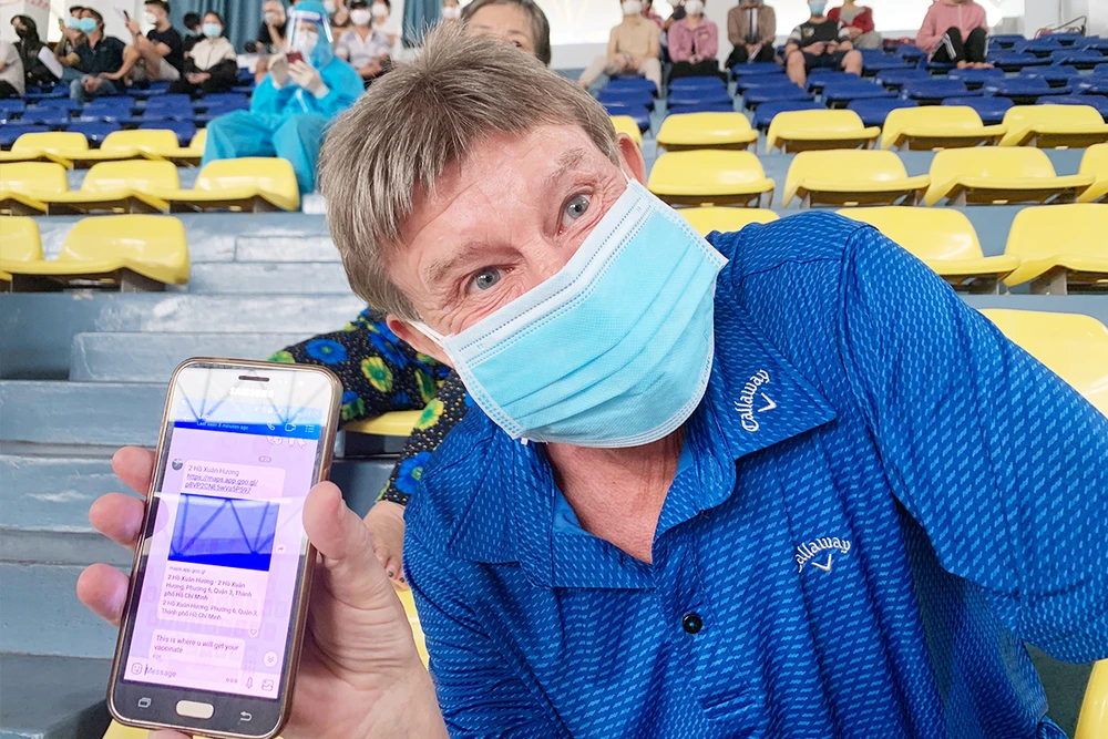 Ông Gary Austin, người Anh, cho biết nhận được tin nhắn của người bạn Việt Nam về điểm tiêm vaccine không cần đăng ký trước. Ảnh: HOÀNG LAN