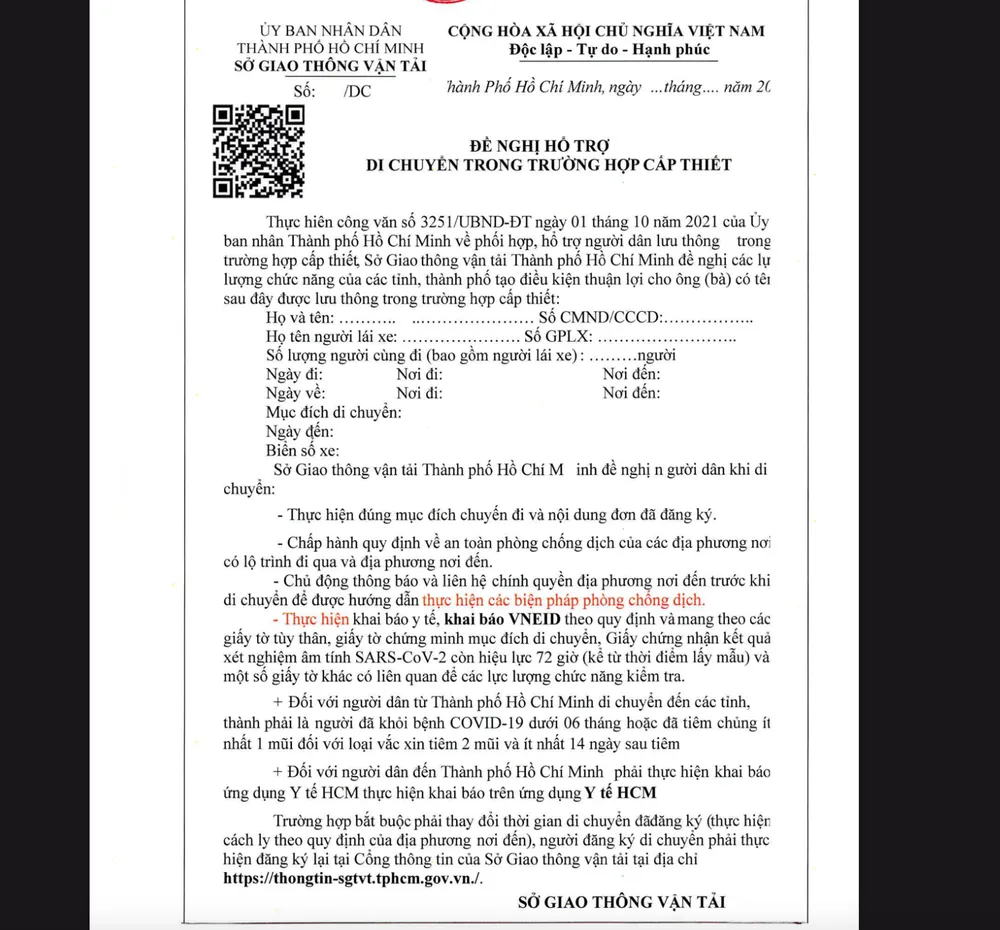 Sở GTVT TP.HCM hướng dẫn việc đăng ký hỗ trợ di chuyển trong trường hợp cấp thiết kể từ ngày 7-10.