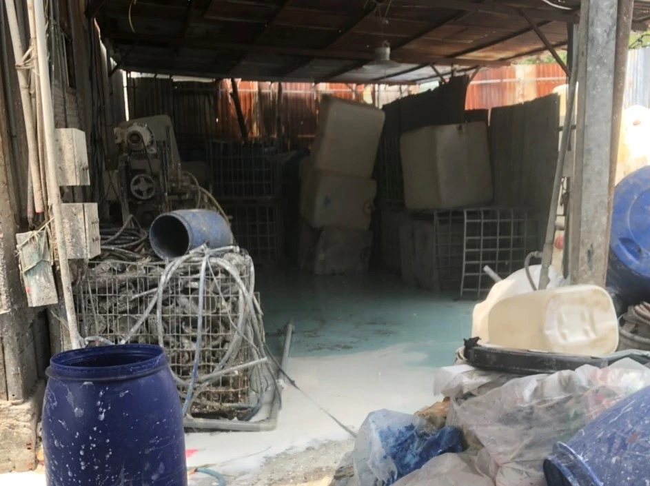 Thời điểm kiểm tra, cơ sở phế liệu vẫn đang tẩy rửa các thùng hóa chất. Ảnh: KD