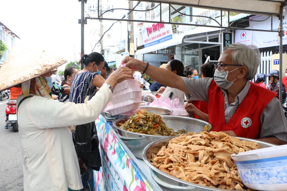 Bà con đi chợ 0 đồng nhận cơm chay miễn phí. Ảnh: MINH QUÂN
