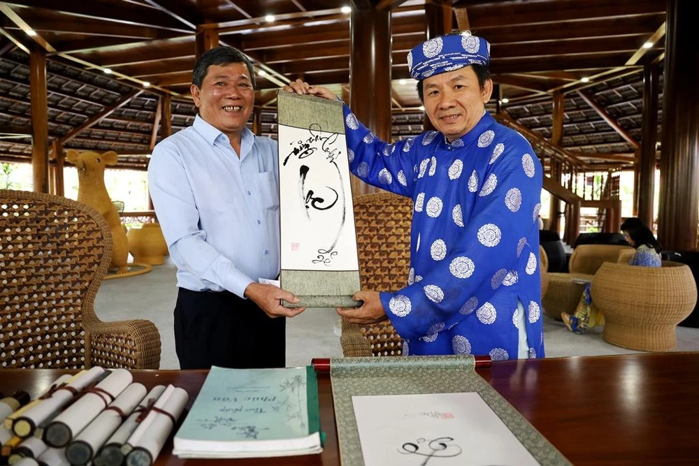 Trình diễn thư pháp. Trong ảnh: Ông đồ tặng chữ Ngọc có hình chú chuột cho ông Lý Bá Lin, Chủ tịch Liên hiệp Các tổ chức hữu nghị tỉnh Khánh Hòa.