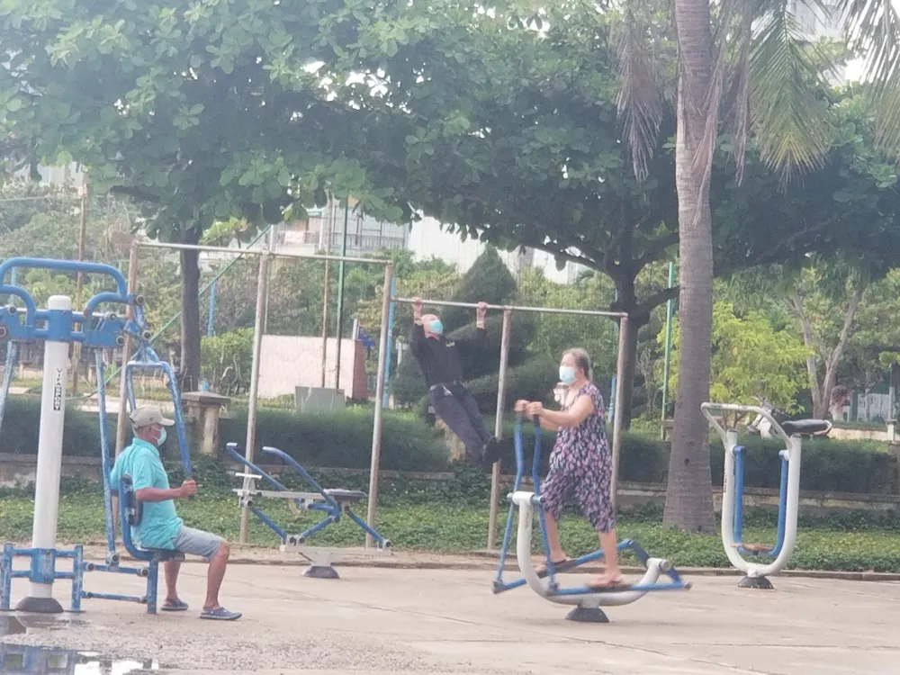 Bà Trần Thị Tuyến (62 tuổi) vừa tập thể dục, vừa phấn khởi nói: “Mấy tháng nay sợ dịch nằm ở nhà nên đổ bệnh, đêm qua nghe tin được phép đi tập thể dục, tắm biển trở lại mà tôi háo hức đến mất ngủ”.