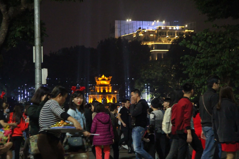 Tháp rùa hồ Gươm sáng lung linh, trên phố tấp nập người qua lại