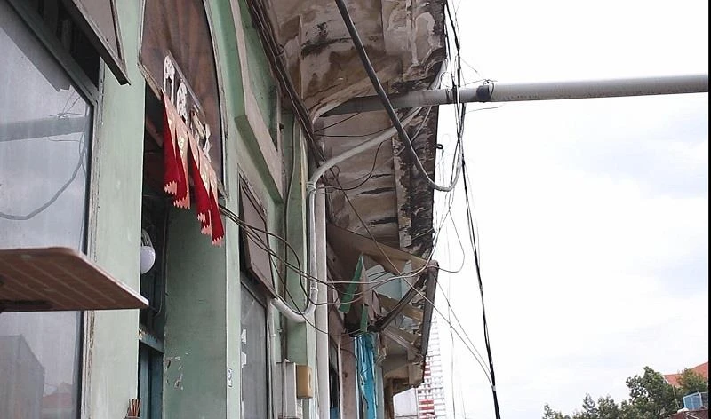 Hệ thống dây điện và mái hiên không đảm bảo an toàn cho người dân. Ảnh: HUẾ XUÂN