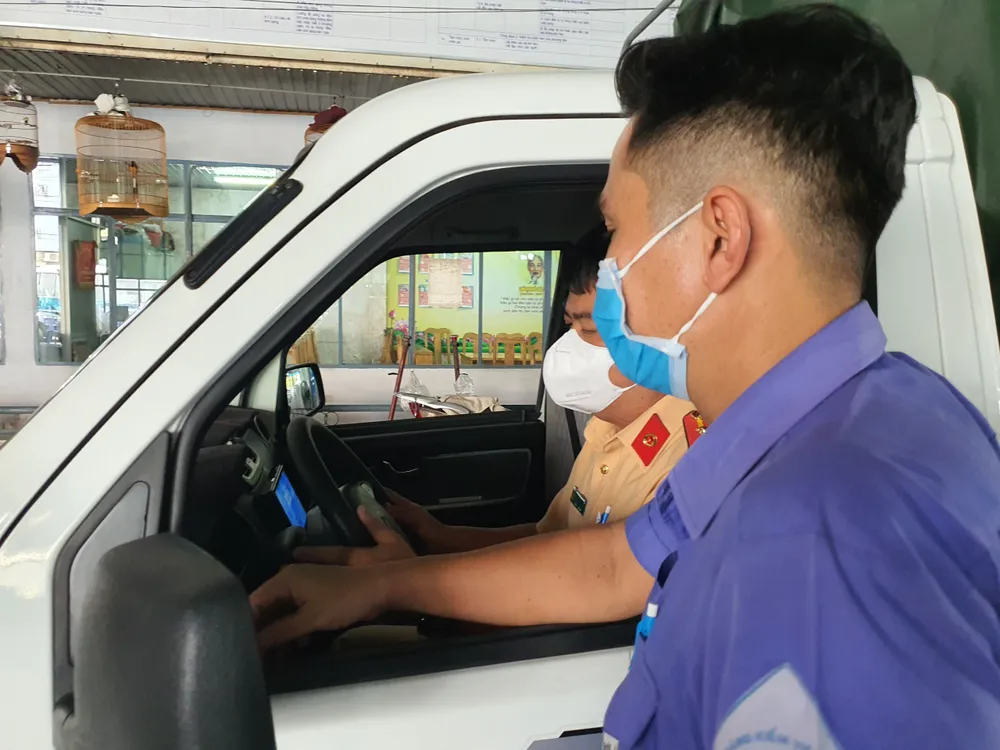Dù 12 giờ trưa, các kiểm định viên và CSGT vẫn làm việc. Ảnh: THY NHUNG |
