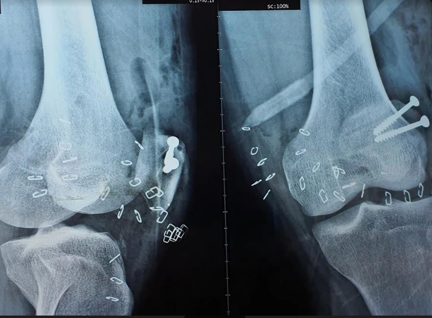 Tại đây, ông H. được chẩn đoán gãy hở xương cẳng chân phải giờ thứ 4, gãy hờ xương bánh chè chân trái và vết thương cổ tay phải. Các BS nhanh chóng cắt lọc thám sát khâu gân cơ, đặt khung cố định ngoài cẳng chân phải và kết hợp xương bánh chè trái. Hiện sức khỏe ông H. đã ổn định.