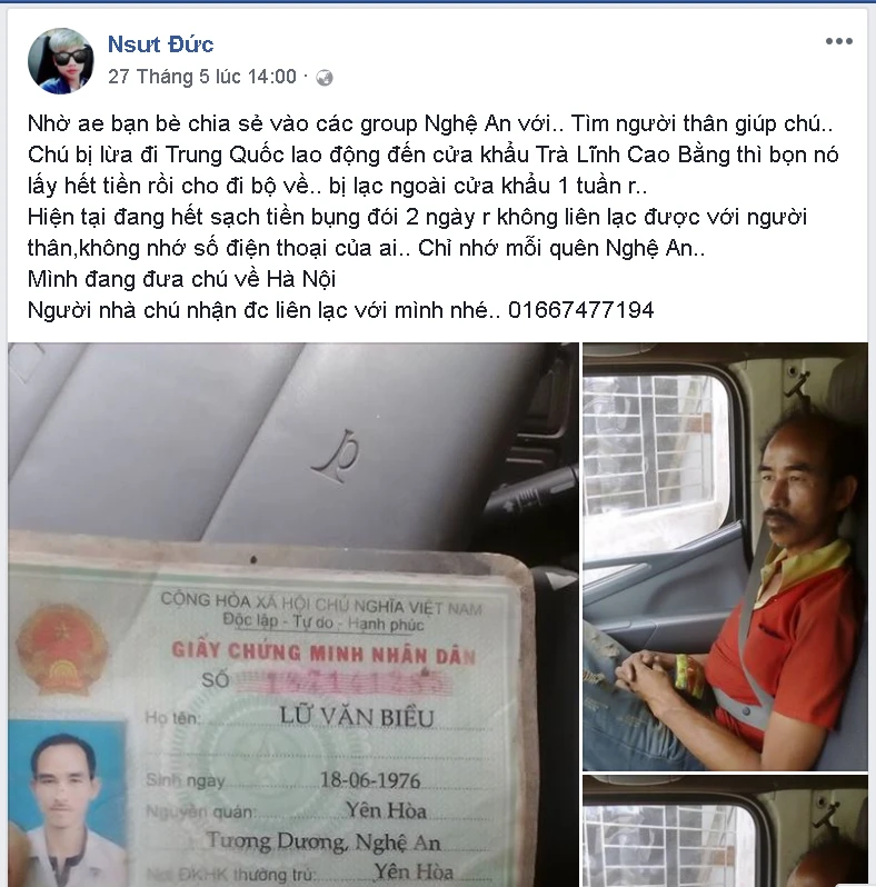 “Chú bị lừa đi Trung Quốc lao động, đến cửa khẩu Trà Lĩnh (Cao Bằng) thì bọn nó lấy hết tiền rồi cho đi bộ về… bị lạc ngoài cửa khẩu 1 tuần rồi... Hiện tại đang hết sạch tiền, bụng đói 2 ngày rồi không liên lạc được với người thân, không nhớ số điện thoại của ai… Chỉ nhớ mỗi quê Nghệ An… Mình đang đưa chú về Hà Nội” - thông tin trên tài khoản Facebook Nsưt Đức chia sẻ.