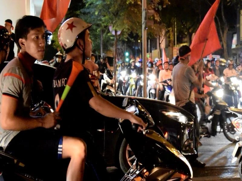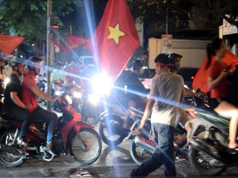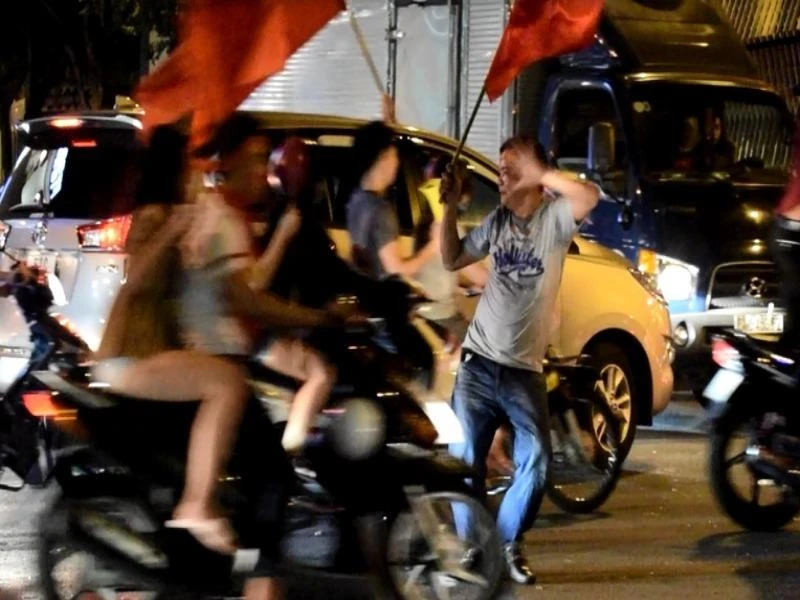 Người đàn ông trung tuổi, đầu đeo băng rôn, tay cầm cờ Tổ Quốc, hào hứng, đứng nhún nhảy suốt hơn tiếng đồng hồ từ bên này đường qua bên kia đường.
