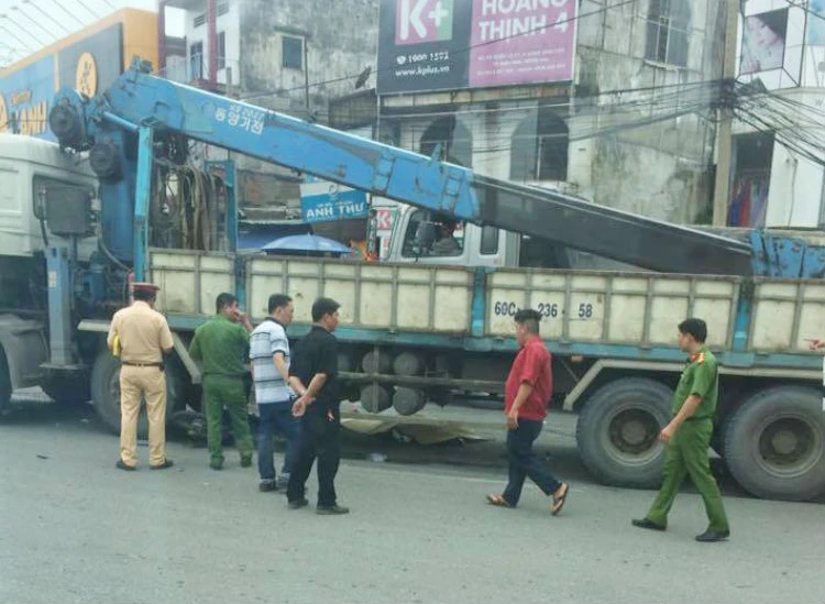 Cú va chạm khiến người đi xe máy khoảng 50 tuổi ngã ra đường và bị xe tải cán qua người.
