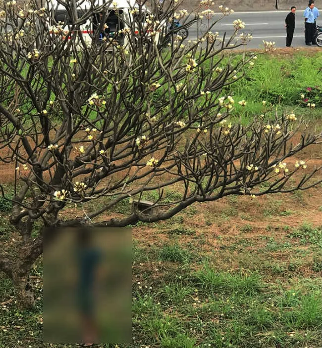 Hiện trường phát hiện thi thể người đàn ông chết trong tư thế treo cổ trên cành hoa bên đường.