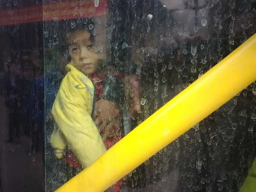 Một em nhỏ cùng cha trên chuyến xe buýt xuống Giáp Bát để về quê