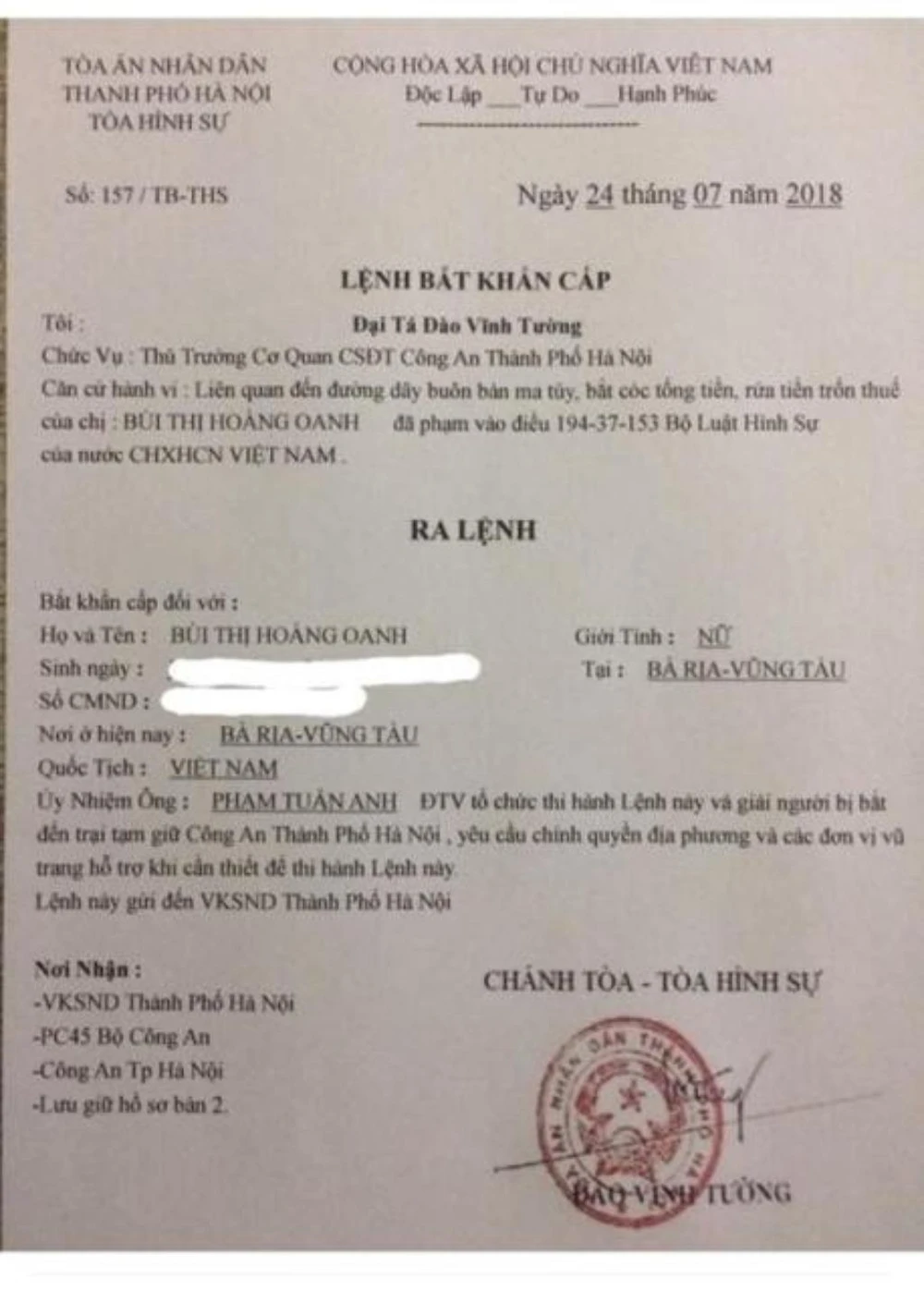 Tuấn Anh này cho chị T. biết chị đang phạm tội rất nguy hiểm và yêu cầu hợp tác điều tra. "Cán bộ công an" cũng gửi qua Viber cho chị T. một bản "Lệnh bắt khẩn cấp" ghi tên chị T. để chị này sợ.