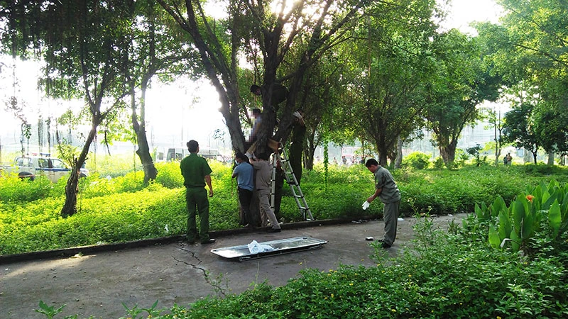 Thi thể người đàn ông được phát hiện treo cổ tử vong nhưng dựa vào chạc ba của cây xanh ở công viên. Ảnh: H.TÂM