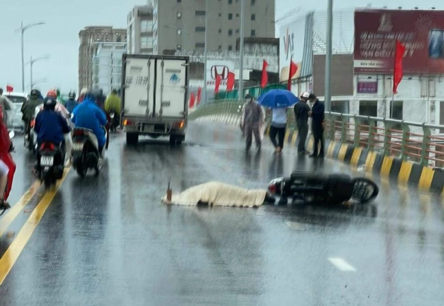 Khi đang chạy trên cầu vượt ngay nút giao thông Trần Thị Lý (phường Hòa Thuận Đông, quận Hải Châu, Đà Nẵng) thì bất ngờ trượt ngã ra giữa đường.
