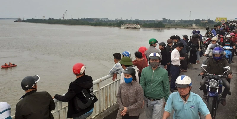 Hàng trăm người đứng trên cầu Bến Thủy dõi theo công tác tìm kiếm cứu nạn.