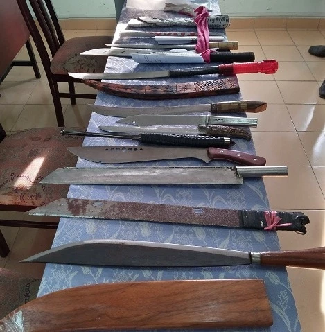 Nhiều hung khí được người dân giao nộp cho công an. Ảnh: CA