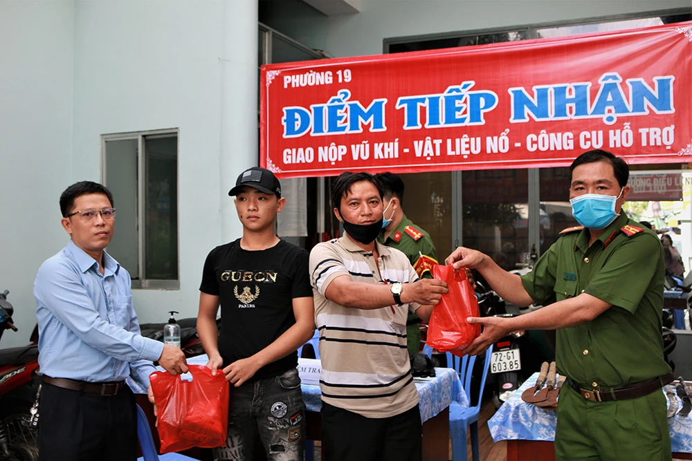 Thiếu tá Nguyễn Minh Phương, Trưởng Công an phường 19 (quận Bình Thạnh) nói rằng đã vận động người dân qua nhiều kênh như họp tổ dân phố, lập các nhóm trên mạng xã hội… “Công an thông báo cho người dân nào có nhặt được, cất giữ vũ khí, vật liệu nổ thì đến công an giao nộp, đổi lấy quà” – ông nói.