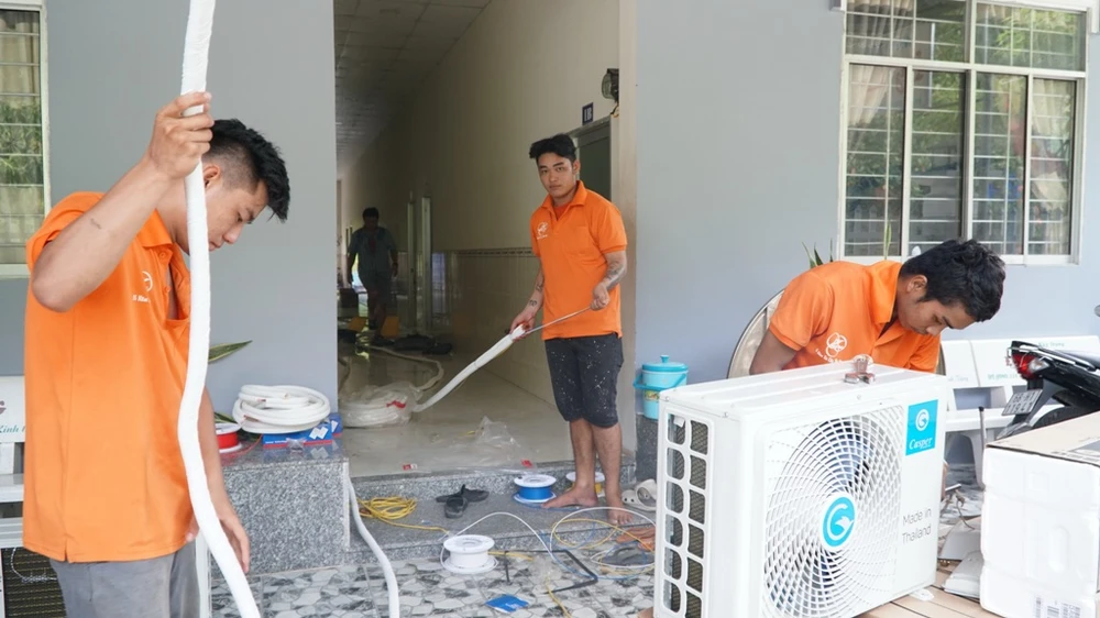 Người dân xã đảo Tiên Hải lắp máy lạnh cho nhà nghỉ phục vụ khách du lịch.
