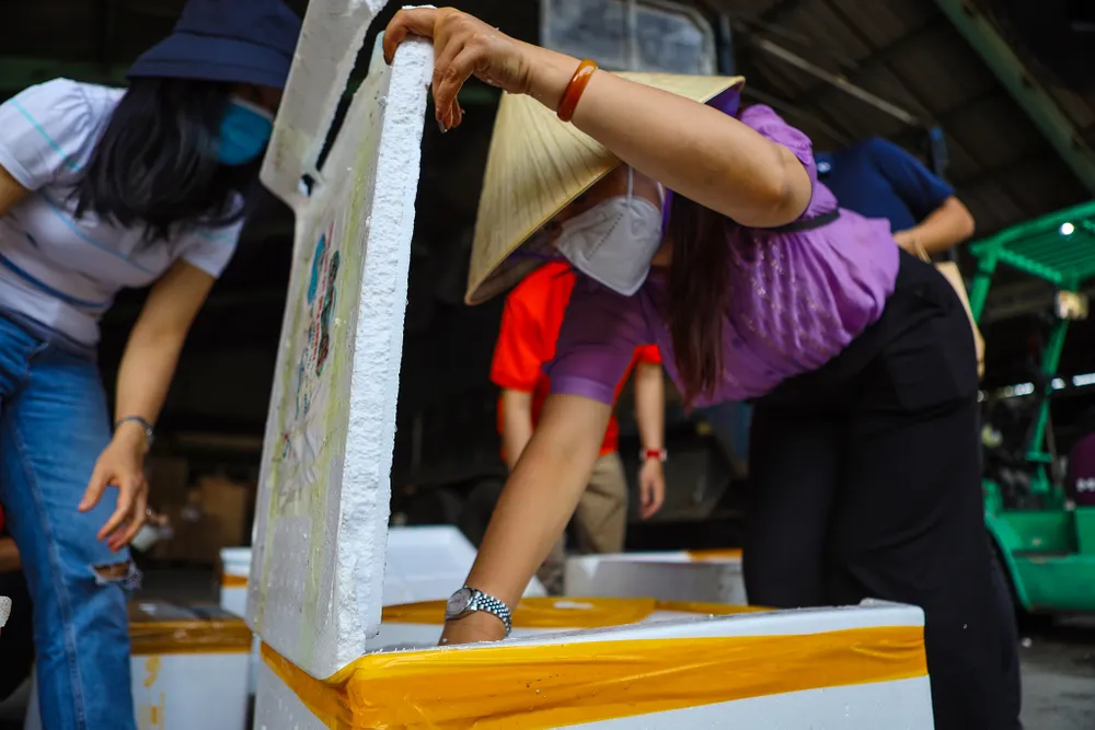 Hàng tấn cá tươi sau khi nhập cảng ở Quảng Bình được các tình nguyện viên thu mua, làm sạch, đóng gói gửi và đến các điểm cách ly, phong tỏa TP.HCM.