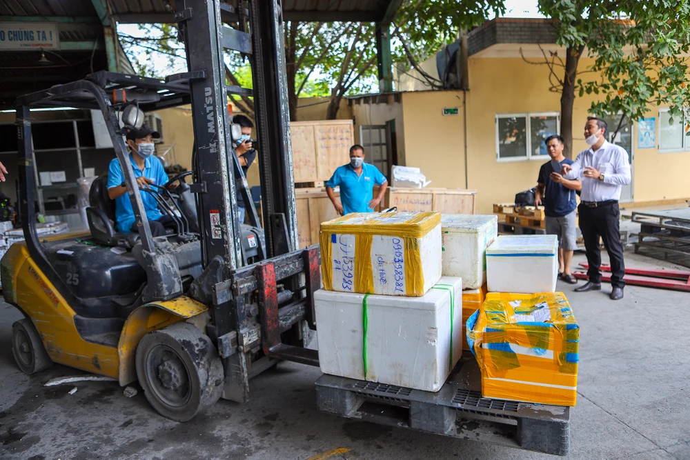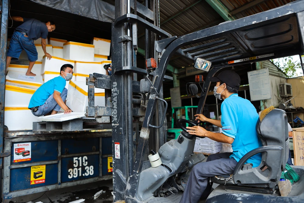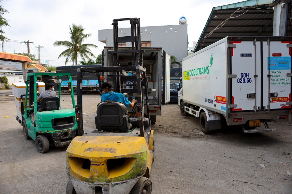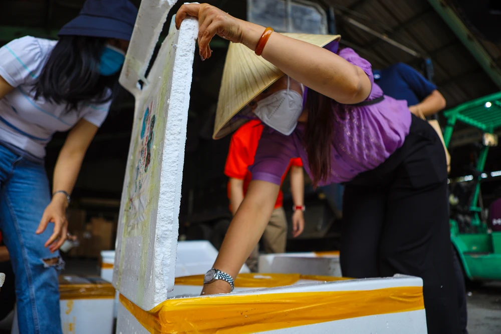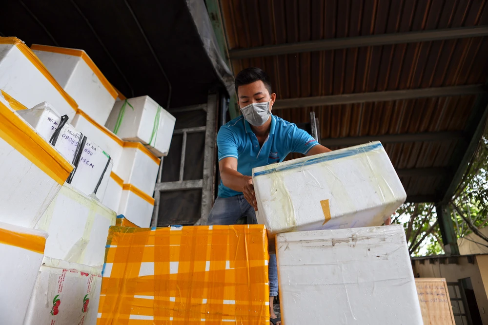 Hàng trăm thùng cá được vận chuyển xuống kho và chia nhỏ ra các xe chuyên dụng để chở đi các quận huyện trên địa bàn TP.HCM tiếp tế cho người dân.