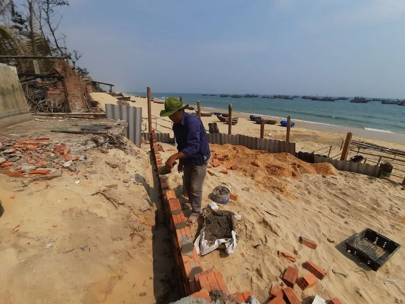 Trong khi chờ các cơ quan chức năng, người dân thôn Hà Lộc chỉ biết tự cứu lấy mình bằng cách xây bờ kè tạm bợ, cơi nới diện tích ra gần bờ biển để chống chọi với sạt lở.