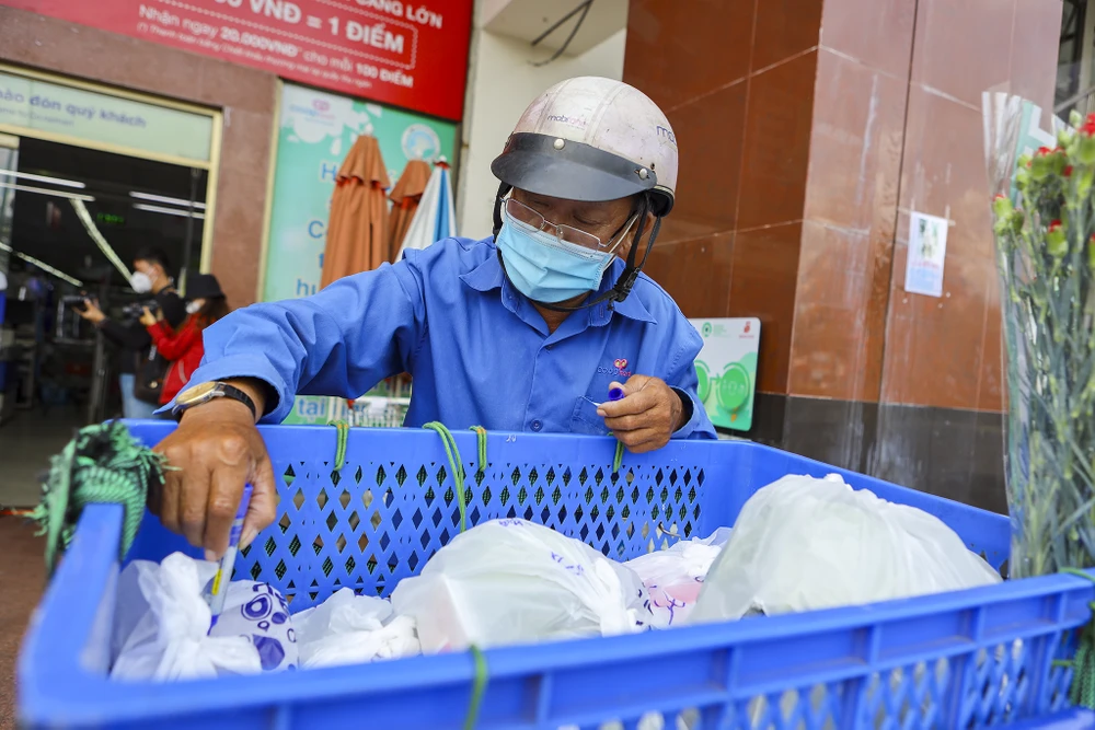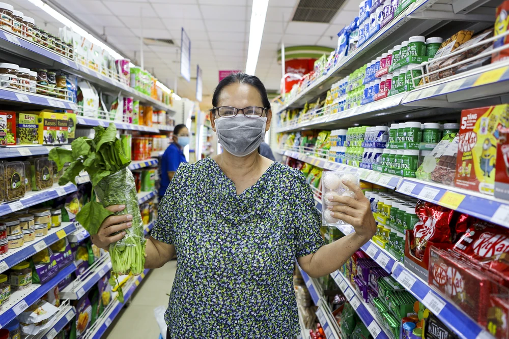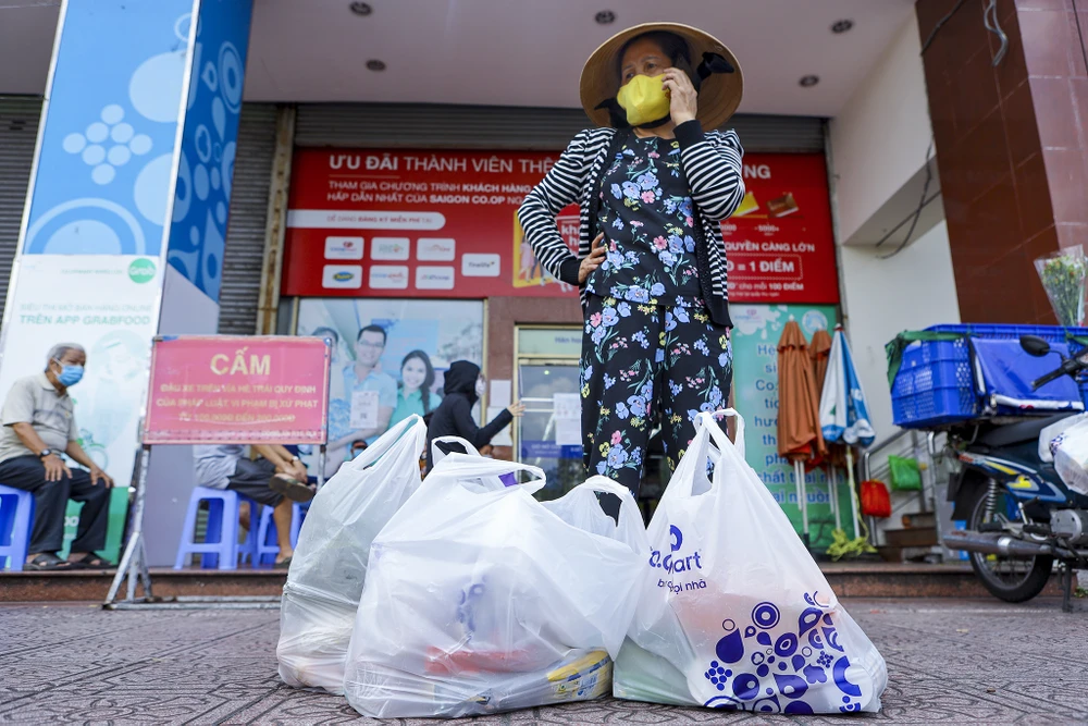 Bà Kim Loan mua được 3 túi thực phẩm, sau khi mua sắm bà gọi điện cho người nhà đến phụ manhg về. Trung bình một người mất hơn 2 giờ cho việc sắp hàng, mua sắm, chờ thành toán.