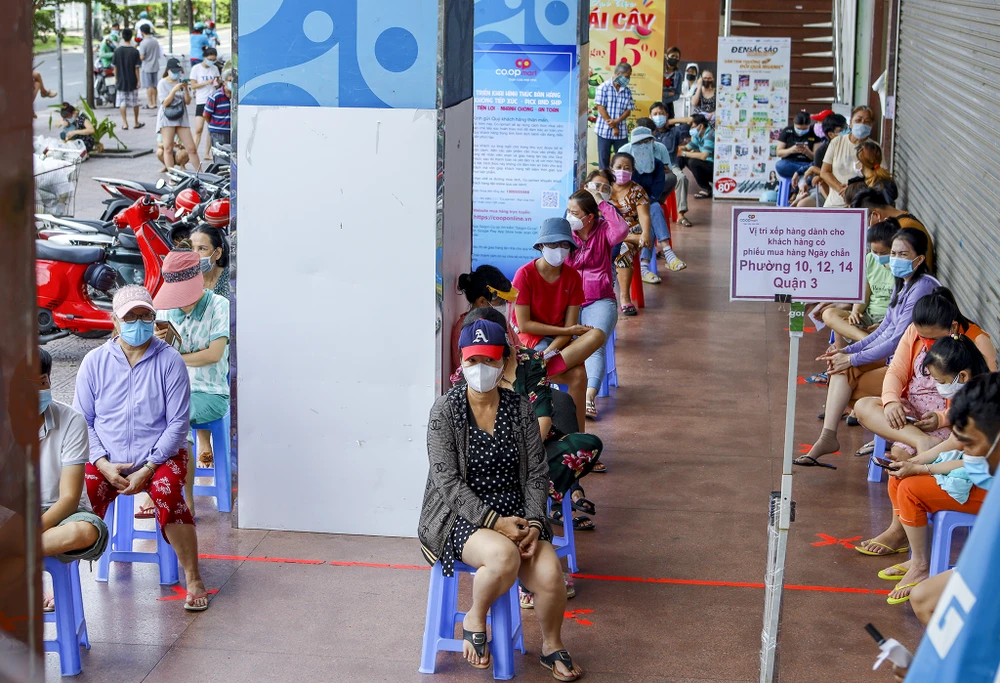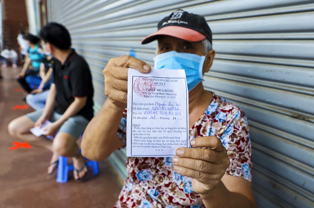 Trên phiếu mua hàng có thông tin đại diện gia đình, số điện thoại, địa chỉ, tổ dân phố, phường và có dấu đỏ của Ủy ban Mặt trận tổ quốc phường. Bà Nguyễn Thị Tư (quận 3), đi siêu thị với phiếu ngày lẻ, bà cho biết. "Gia đình được phát phát phiếu từ hai hôm trước, đi siêu thị trong thời điểm này mất chút thời gian chờ đợi, nhưng đỡ lo hơn".