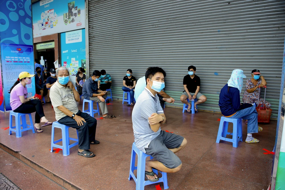 Khi chờ tính tiền, người dứng đứng đúng vạch, giữ khoảng cách tuyệt đối.