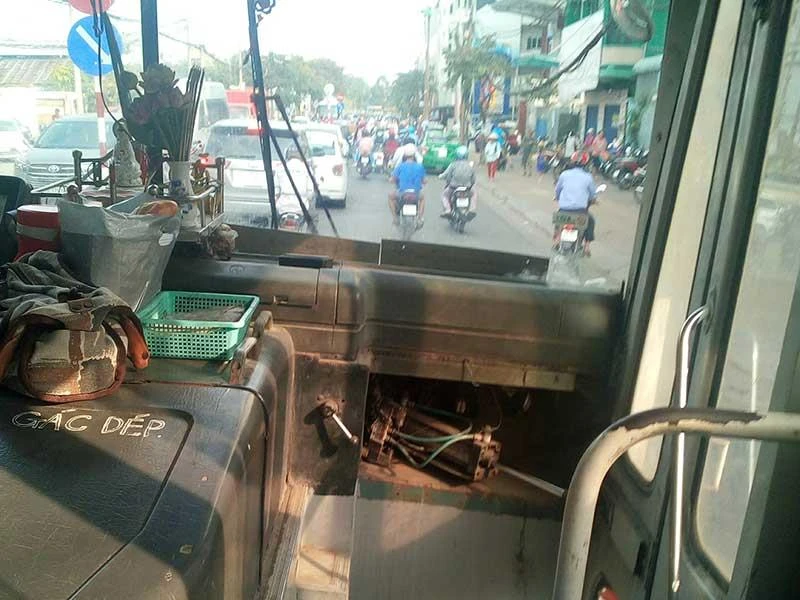 Dây điện trên xe buýt lòi ra ngoài, dễ gây nguy hiểm cho hành khách. Ảnh: CẨM GIANG