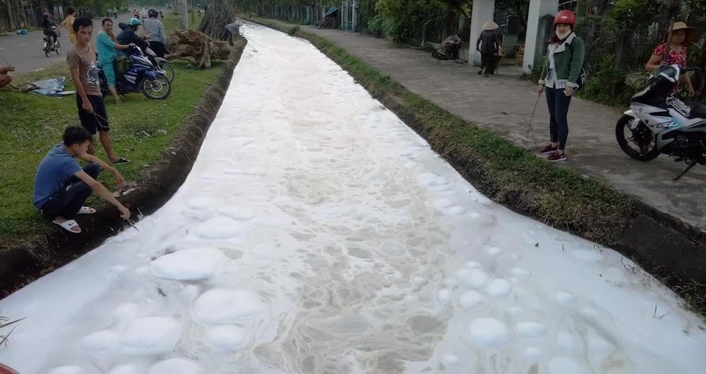 Kênh sủi bọt trắng, cá chết vì hoá chất có mùi thuốc trừ sâu. Ảnh: TN.