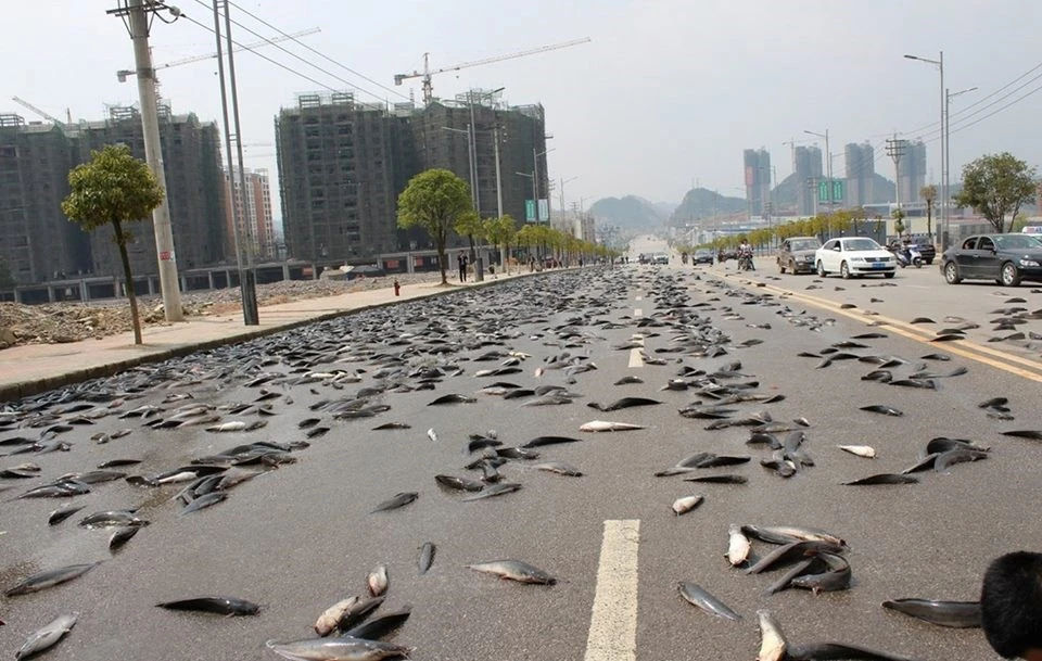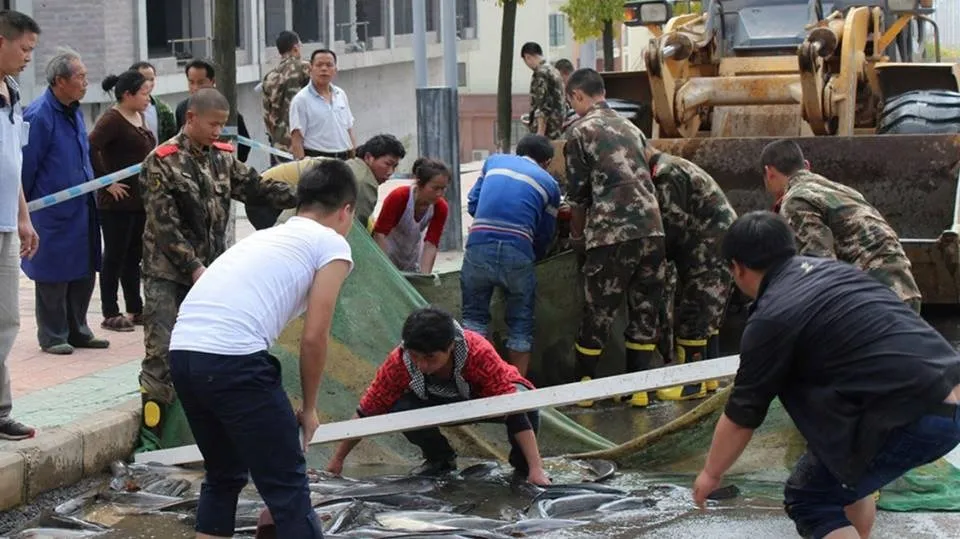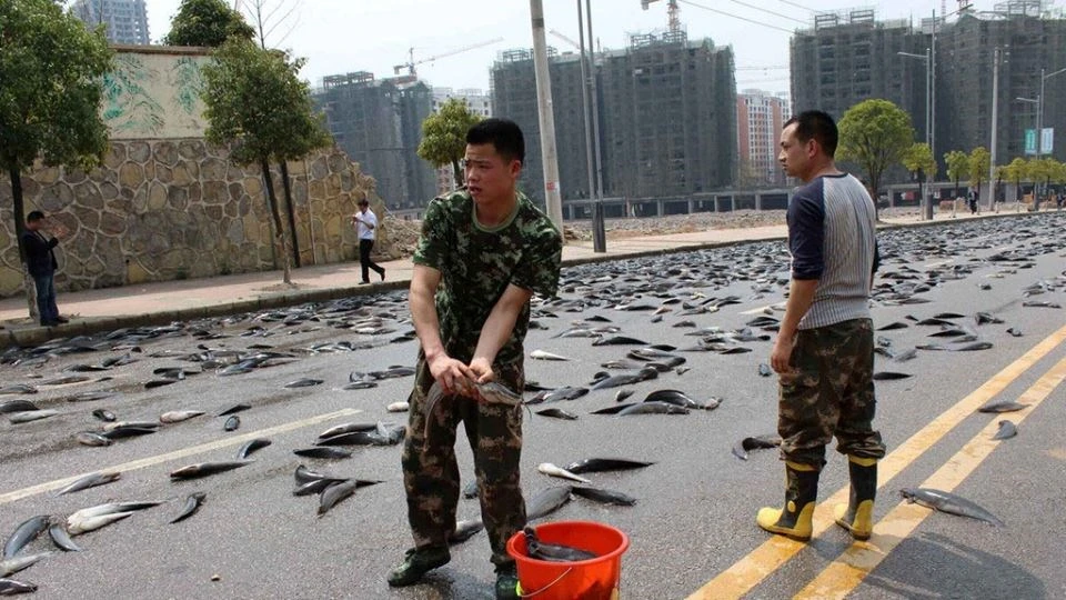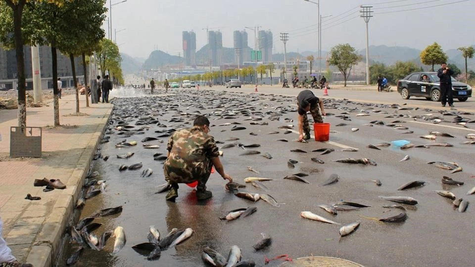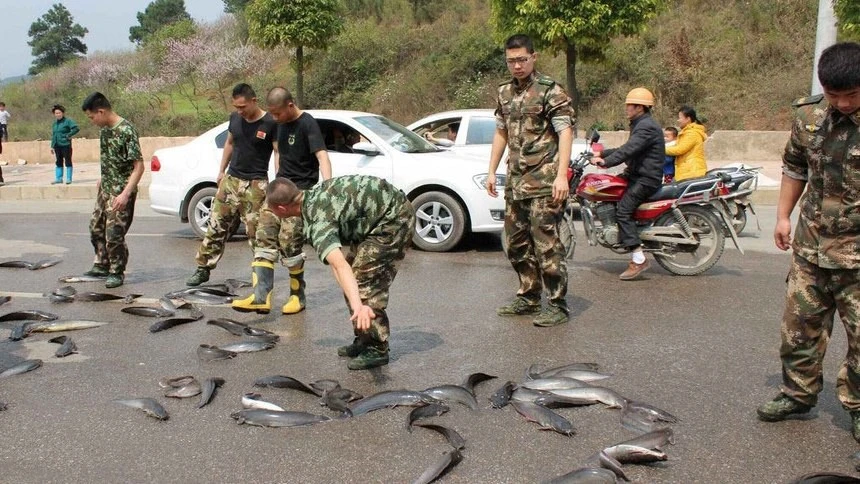 Gần 7 tấn cá vương vãi khắp nơi. (Nguồn: CCTV)