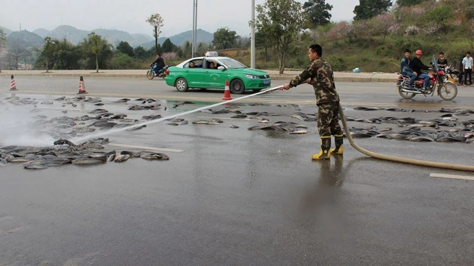 Người dân địa phương và lính cứu hỏa đã phải mất tới hai tiếng để dọn đống cá trên đường. (Nguồn: CCTV)