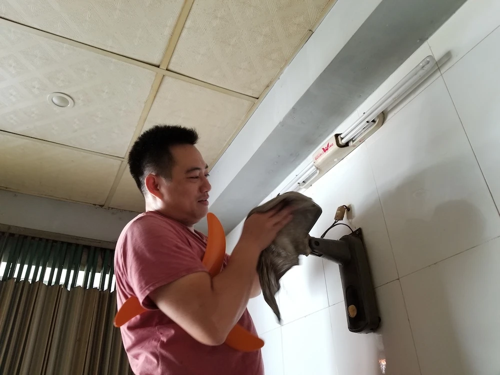 Anh Nguyên lau chùi quạt chờ nước rút sẽ buôn bán trở lại. Ảnh: Thanh Nhật