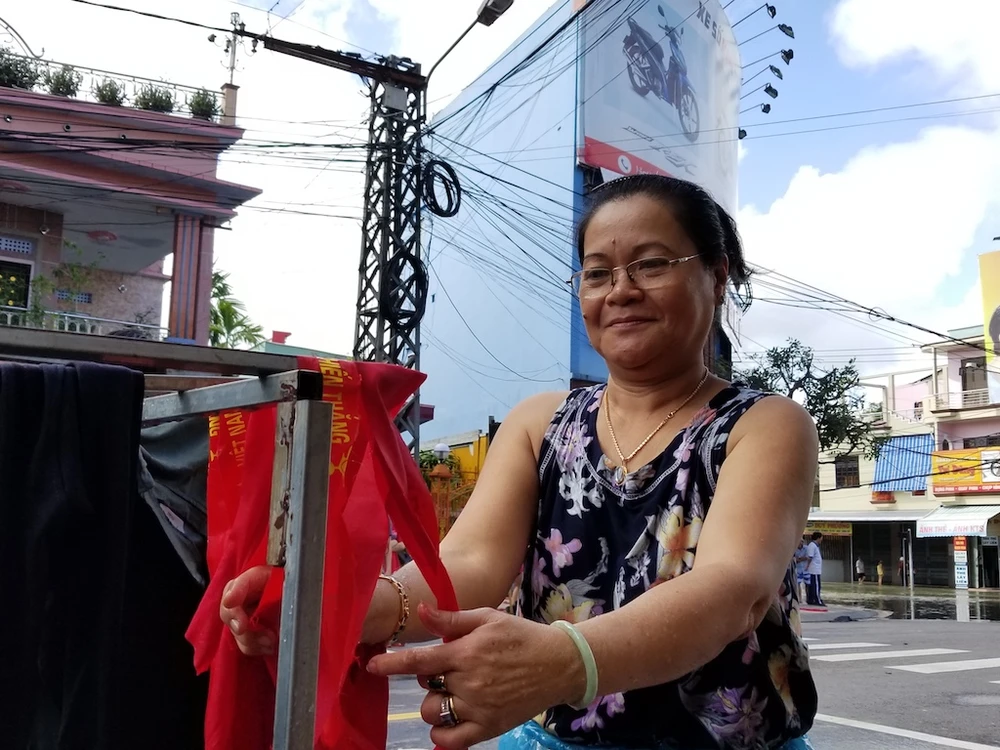 Bà Hà phơi băng rôn cổ vũ đội tuyển Việt Nam vừa in chuẩn bị bán cho CĐV thì bị ngập ướt. Ảnh: THANH NHẬT