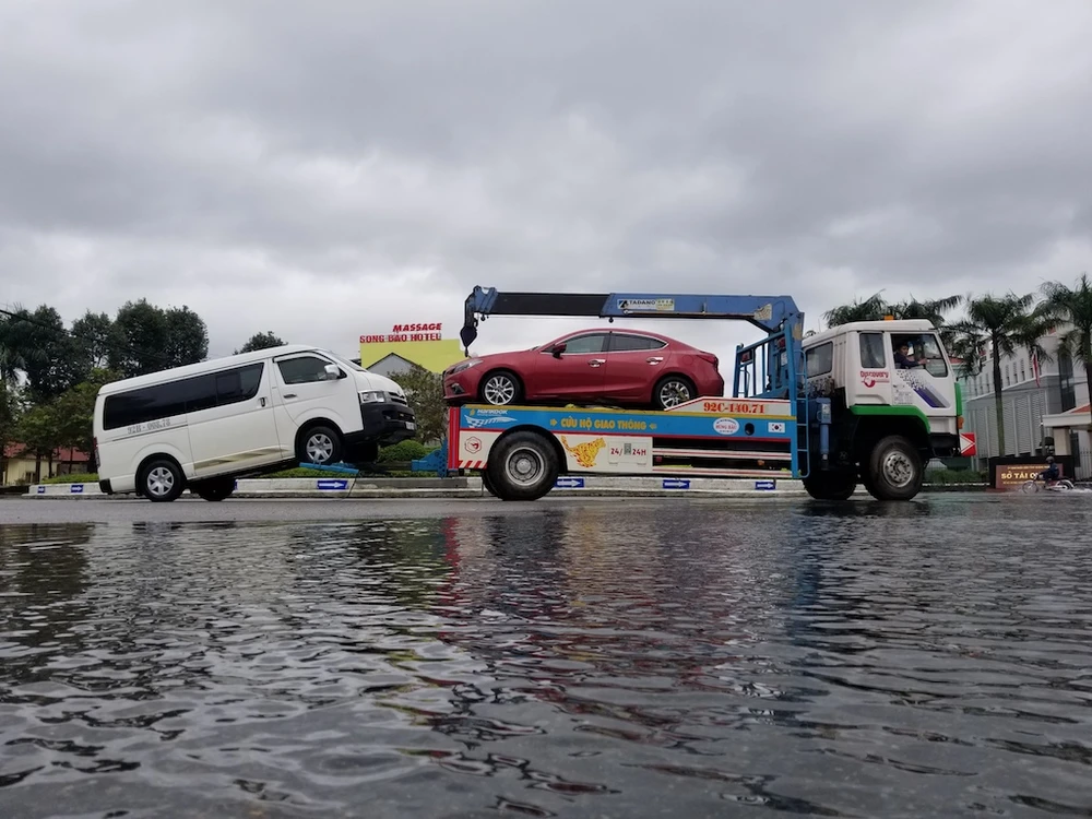 Cứu hộ ô tô ra khỏi vùng ngập nước. Ảnh: THANH NHẬT