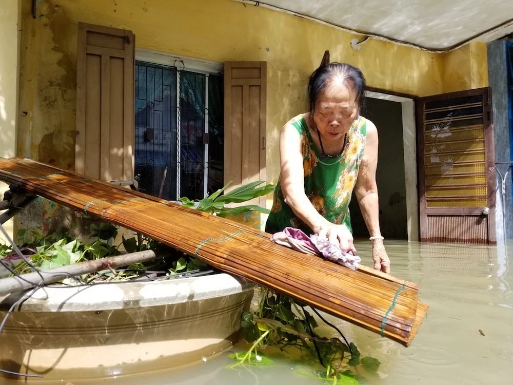 Một cụ già dọn dẹp nhà cửa khi nước đang rút dần ra khỏi nhà để chuẩn bị dọn vào ở trở lại. Ảnh: THANH NHẬT