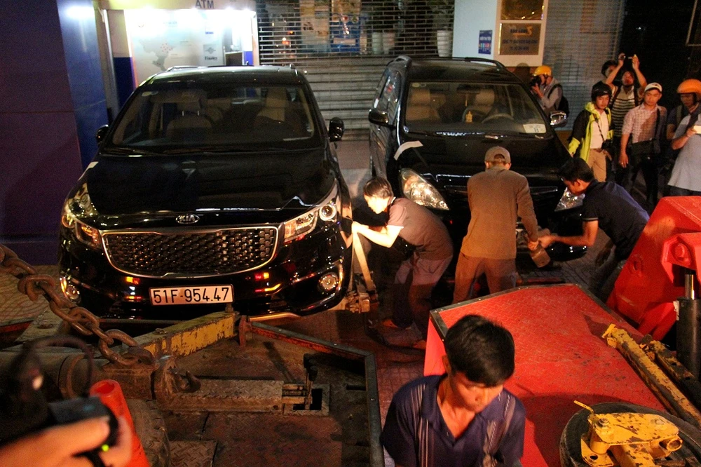 Ôtô đậu trên vỉa hè đường Sương Nguyệt Anh cũng bị cẩu về phường.