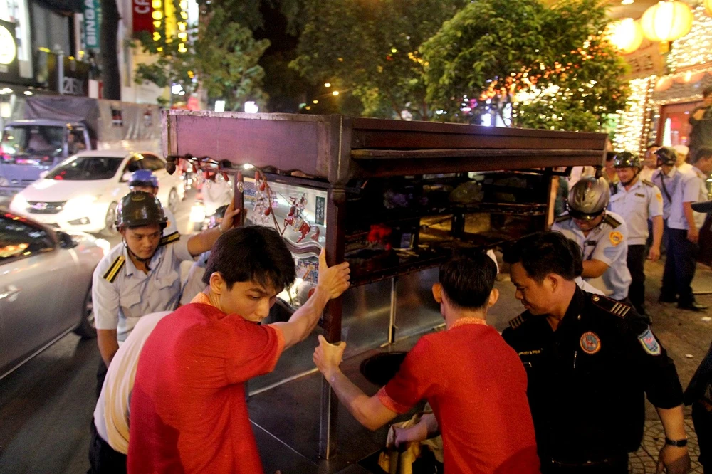 Trở lại kiểm tra đường Nguyễn Trãi, ông Đoàn Ngọc Hải yêu cầu lập biên bản và tịch thu xe bán hàng của một nhà hàng do đặt lấn chiếm vỉa hè.