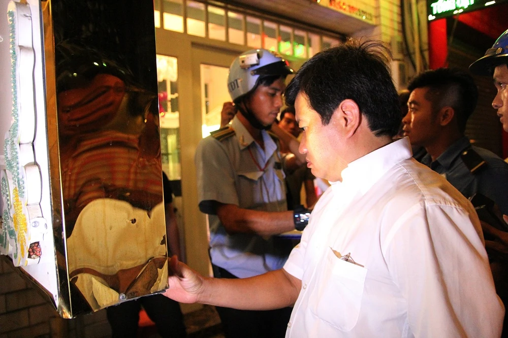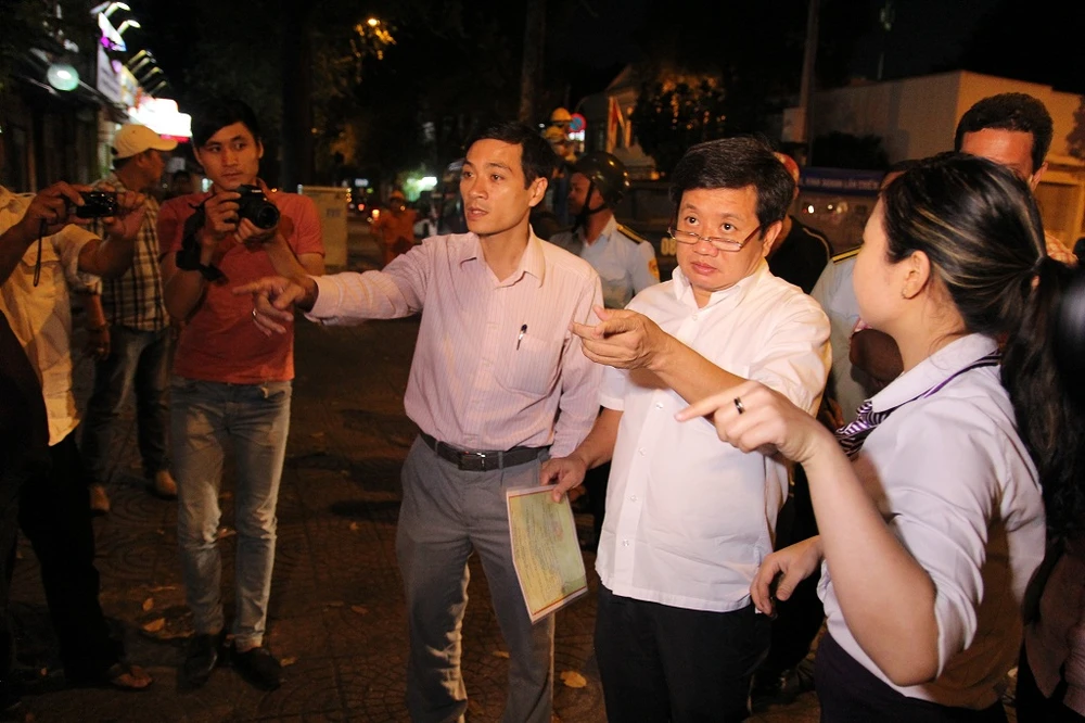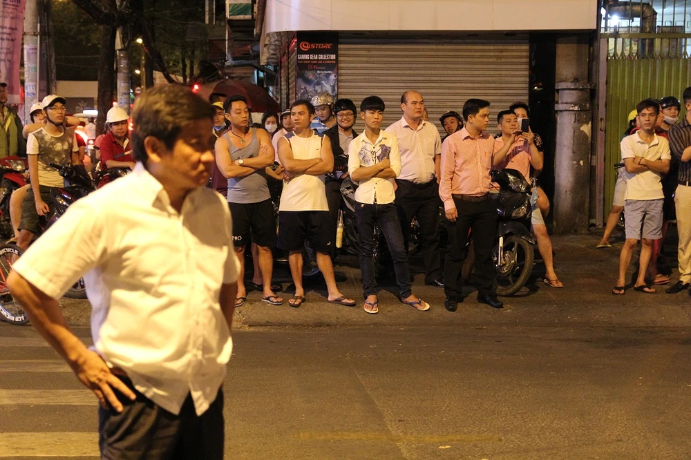 Dù gần 23 giờ, nhưng rất đông người dân hiếu kỳ vẫn đứng hai bên đường xem Phó chủ tịch Đoàn Ngọc Hải xử lý vi phạm vỉa hè.