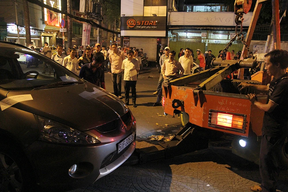 Ôtô bị cẩu về trụ sở khi đậu trên vỉa hè đường Phạm Hồng Thái.