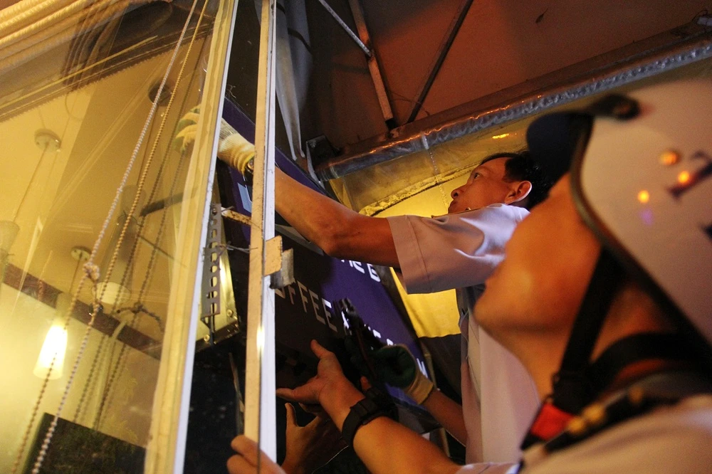 Biển hiệu sau khi tháo dỡ được đưa lên xe của đoàn công tác.