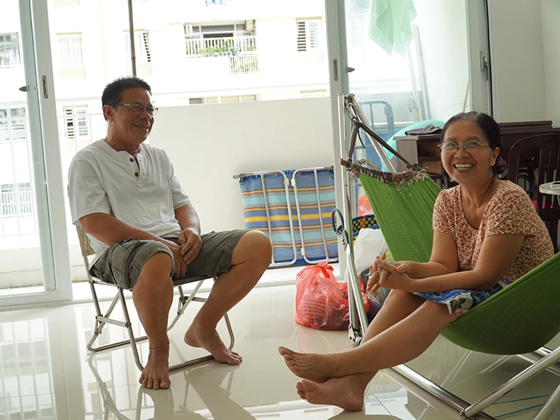 Vợ chồng bà Nguyễn Thị Bích Vân thở phào khi dọn về tạm cư tại chung cư Bình Khánh.