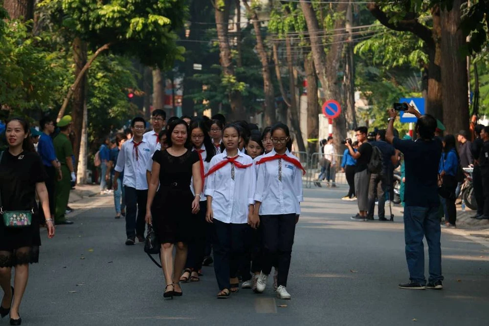 Ngay từ sáng sớm, rất đông người dân cầm theo di ảnh cố Tổng Bí thư Đỗ Mười đứng dọc các tuyến đường gần Nhà tang lễ Quốc gia.