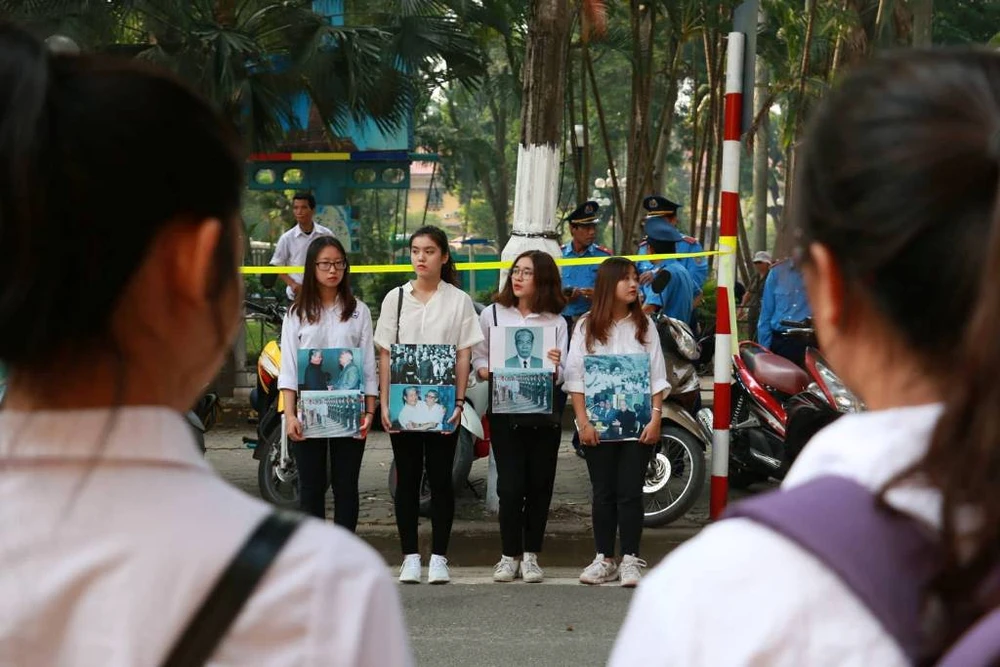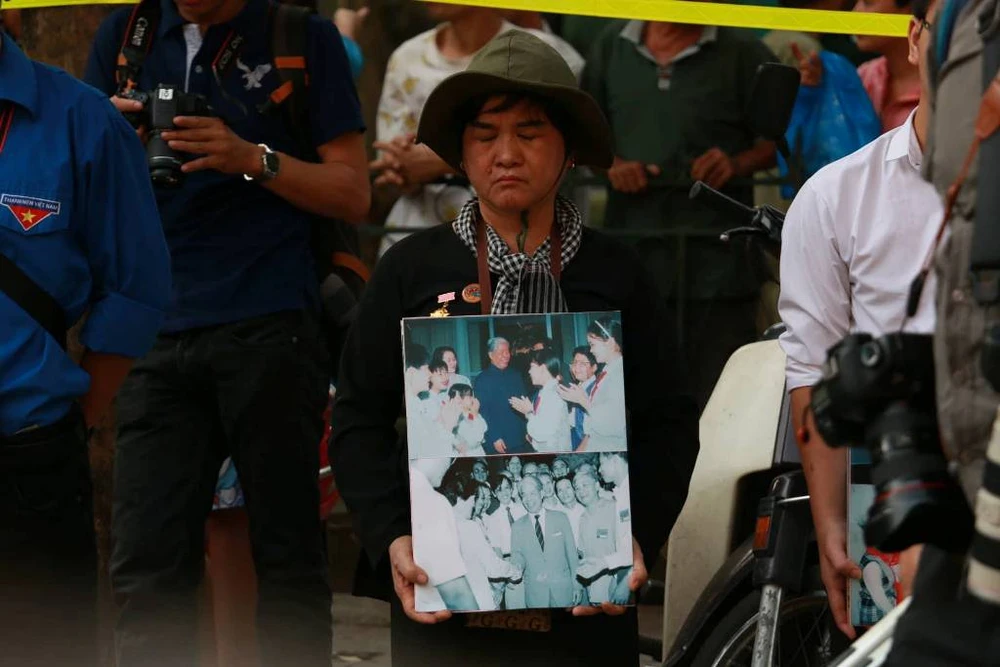 Người dân cầm theo di ảnh cố Tổng Bí thư Đỗ Mười đứng dọc các tuyến đường gần Nhà tang lễ Quốc gia.