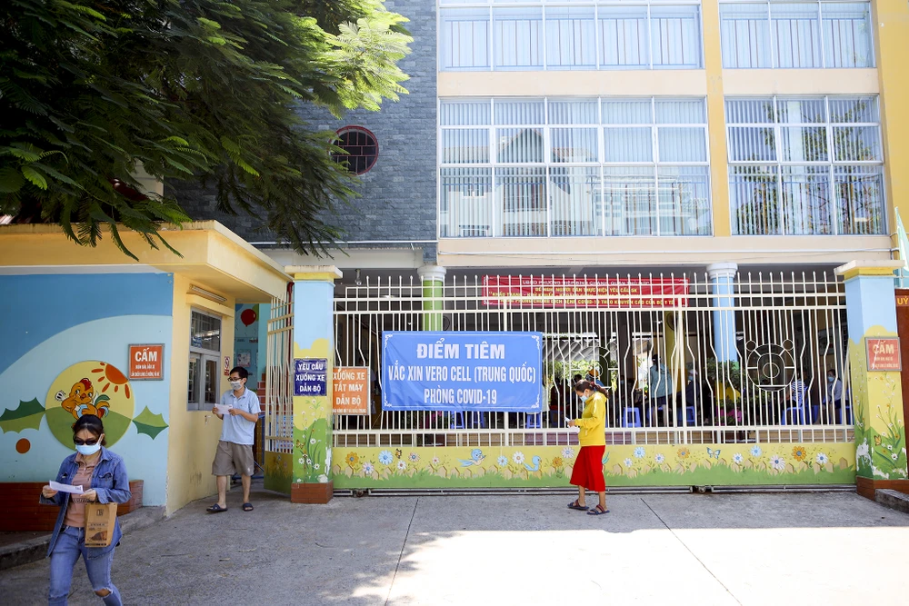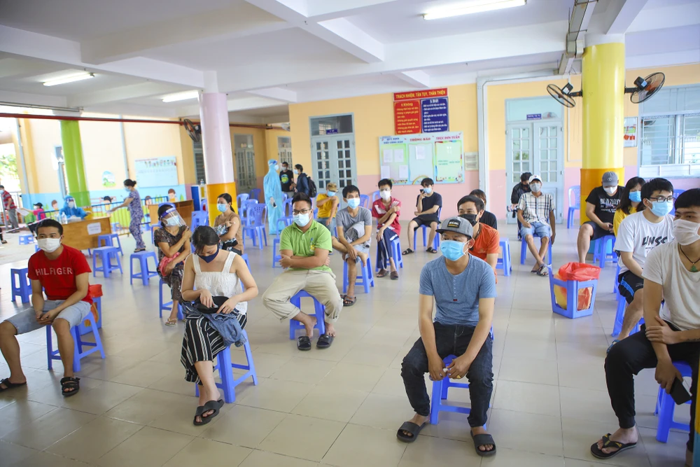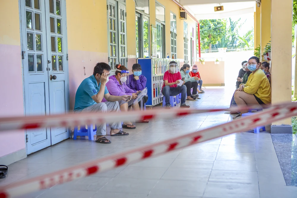 Tại điểm tiêm Trường Mầm non Sơn Ca, khu phố 6, phường Hiệp Bình Chánh, TP Thủ Đức, từ 8h giờ sáng, công dân trên 18 tuổi trên địa bàn được tiêm vaccine ngừa COVID-19.
