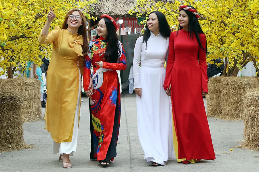 Những cô gái diện áo dài thướt tha dạo chơi ở vườn mai vàng bên trong khuôn viên Nhà văn hóa Thanh niên (quận 1, TP.HCM) những ngày cận tết. Ảnh: HOÀNG GIANG