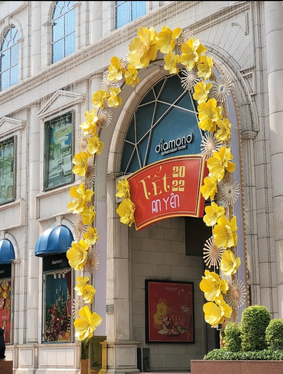Suốt những tuần qua, khu vực Trung tâm thương mại Diamond Plaza (quận 1) trang trí với cổng vào chính của trung tâm là dòng chữ Tết an yên.