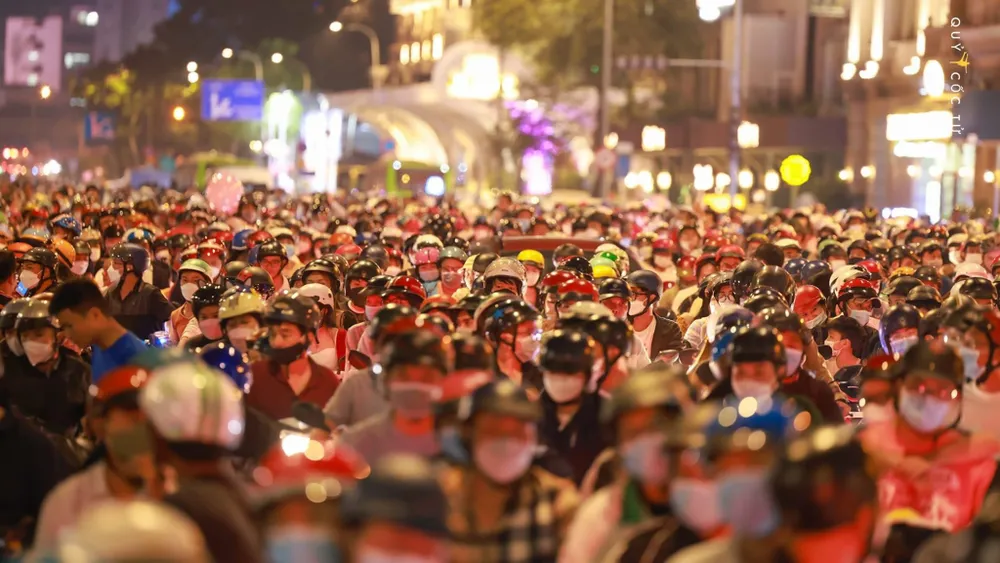 Đêm dần về khuya, trời trở lạnh thế nhưng trước nhà thờ Đức Bà, dòng người vẫn đổ về kín khắp đoạn đường Lê Duẩn. Dòng người và xe phải nhích từng chút một khi di chuyển qua đoạn đường này.