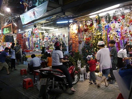 Các cửa hàng bán phụ kiện trang trí Giáng sinh trên đường Võ Thị Sáu, Q.1 những ngày này cũng thu hút nhiều khách tham quan, mua sắm. Ảnh: H.TRÂM Bênh cạnh đó, các cửa hàng bán đồ trang trí cho Giáng sinh mấy ngày này cũng thu hút rất nhiều người quan tâm và mua sắm. Dạo quanh các cửa hàng trên đường Nguyễn Thị Minh Khai,Võ Thị Sáu (Q.1), đường Hai Bà Trưng, đường Kỳ Đồng (Q.3) và một số của hàng bán sỉ - lẻ trên đường Hải Thượng Lãn Ông (Q.5), rất nhiều đồ trang trí được bày bán, đa dạng về mẫu mã và giá cả. Điều này đã thu hút rất nhiều người tham quan, mua sắm. Các vị khách nước ngoài cũng mua hàng trang trí Giáng sinh để hòa mình vào không khí nhộn nhịp. Ảnh: H.TRÂM Võ Cẩm Tú, chủ một gian hàng bán phụ kiện trang trí Giáng sinh trên đường Võ Thị Sáu cho biết: “Những ngày gần đây cửa hàng tôi có khá nhiều khách tham quan, mua sắm các phụ kiện để trang trí cho ngày lễ Giáng sinh. Hiện cửa hàng bán chạy nhất là các cây thông noel, dây đèn màu, hạt châu. Giá cả chênh lệch so với những năm trước không nhiều". Rất đông người tập trung trước sảnh Diamond Plaza để chụp hình. Ảnh: H.TRÂM Khách sạn Sheraton (Đông Du, Q.1) cũng trang trí bắt mắt trước thềm Giáng sinh. Ảnh: H.TRÂM Những ngày gần đây, từ chiều tối có khá nhiều người tập trung trước các Trung tâm thương mại Diamond Plaza (Q.1), Vincom (Q.1), Parkson (Q.1) để chụp ảnh làm kỉ niệm. Không những thế, nhiều người bán các vật trang trí cho du khách cũng tìm đến khiến những nơi này trở nên nhộn nhịp hơn bao giờ hết.